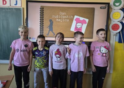 U našoj školi obilježili smo ovaj dan kako bismo poslali jasnu poruku da nasilju nema mjesta u našem okruženju. Učenici i učitelji odjenuli su ružičaste majice kao simbol podrške borbi protiv nasilja te su kroz razgovore, radionice i zajedničke aktivnosti promicali vrijednosti prijateljstva, empatije i zajedništva.