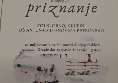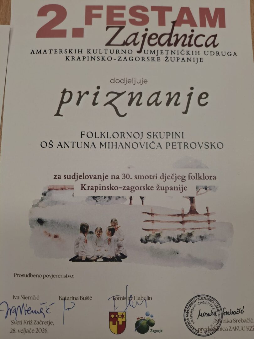 Folklorna skupina učenika 3.a by Josipa Brgles | ožu 2, 2026 | Vijesti Folklorna skupina učenika 3.a OŠ Antuna Mihanovića Petrovsko uspješno je nastupala na 30. smotri dječjeg folklora Krapinsko – zagorske županije. Smotra je održana 28.02.2026. godine u OŠ Sveti Križ Začretje. Zahvaljujemo roditeljima na podršci.