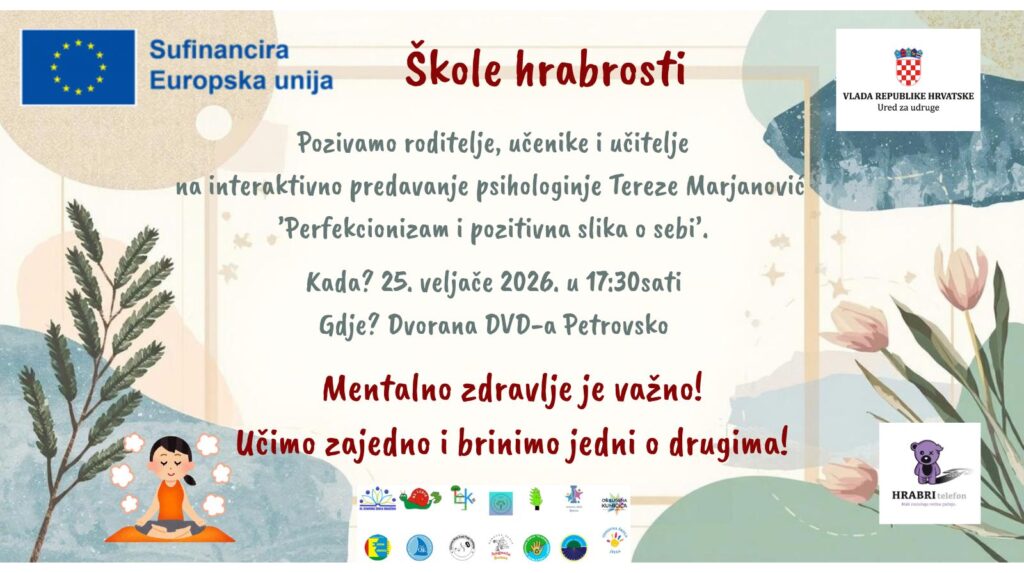 pozivamo vas da 25. 2. 2026. prisustvujete interaktivnom predavanju ”Perfekcionizam i pozitivna slika o sebi” koje će održati psihologinja Tereza Marjanović. Susret je organiziran u sklopu projekta Škole hrabrosti u kojemu smo partner Hrabrom telefonu te predstavlja prvu aktivnost s roditeljima. Susret će se održati u 17:30 sati u dvorani DVD-a Petrovsko. Predviđeno vrijeme trajanja predavanja je 45 minuta. Nakon predavanja možete se informirati o mentalnom zdravlju u info kutku, razgledati izložbu plakata učenika naše škole te se podružiti uz razmjenu iskustava o očuvanju mentalnog zdravlja.