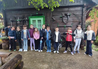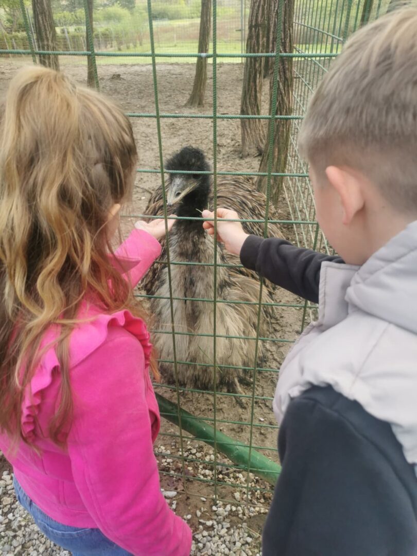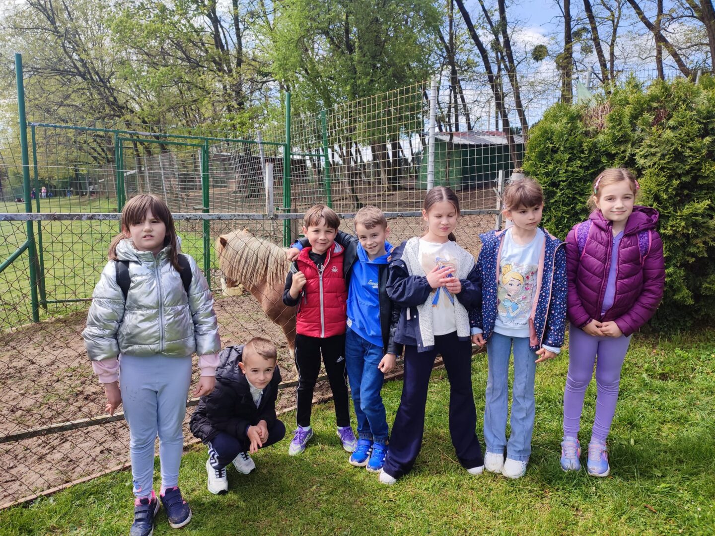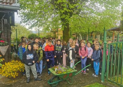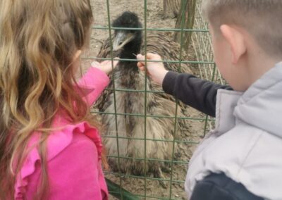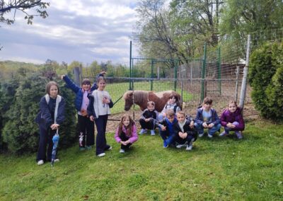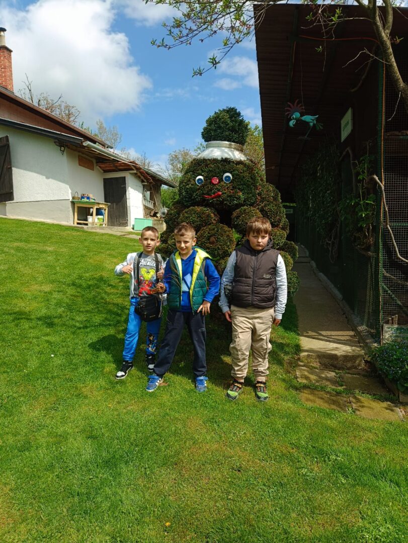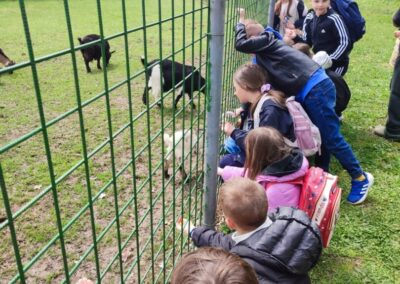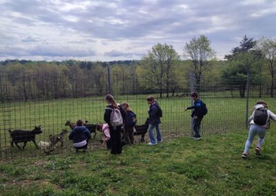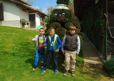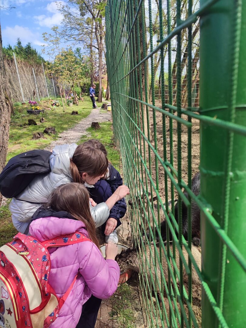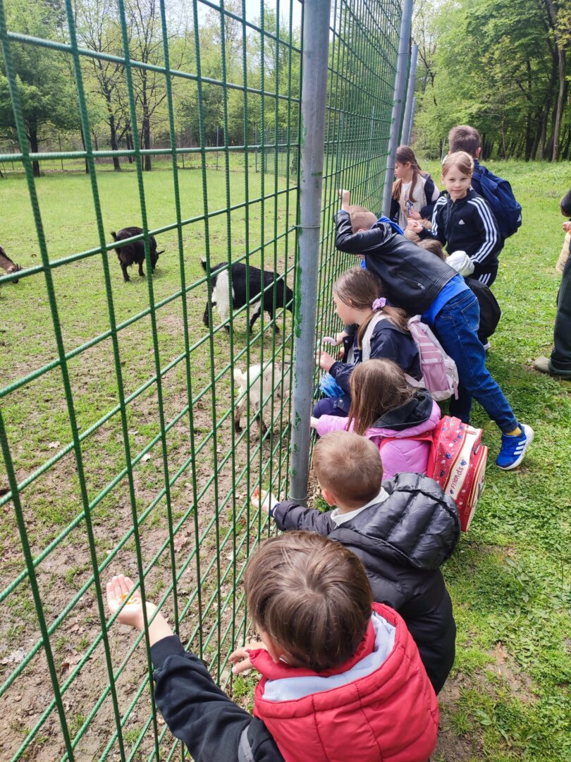 U Zoo Erveniku dočekali su ih g. i gđa. Hunjak i s veseljem ih proveli po svom malom zoo-u. Prekrasno uređeno dvorište ispunjeno je ograđenim prostorima u kojima žive različite životinje. Vidjeli smo više vrsta kokoši, a najzanimljiviji su nam bili Jurek i Katica – mini koke. U nekim nastambama živi više životinjskih vrsta koje se odlično slažu. Plahi jeleni žive s mini kozama. Domaćin je pomogao učenicima nahranniti koze pa su se jeleni, kad su vidjeli hranu, malo opustili i prišli bliže.