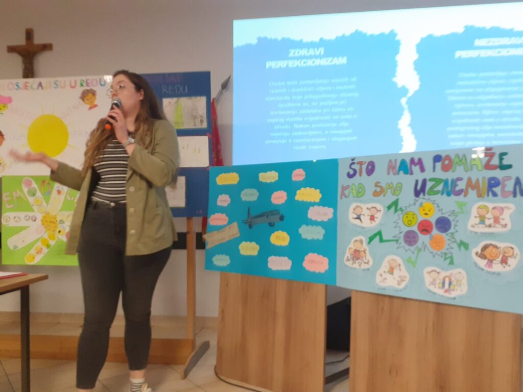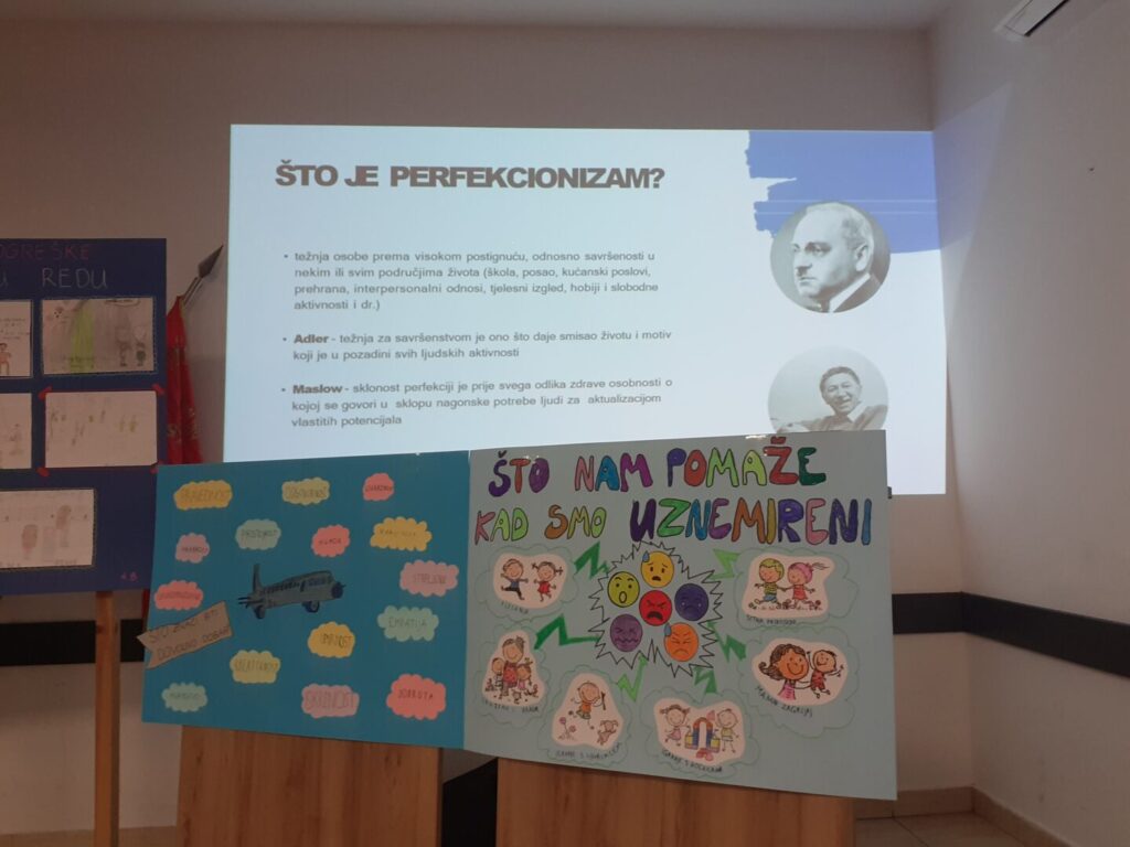Uz zaista veliki odaziv roditelja, učenika i učitelja, tražilo se mjesto više. Gošća predavačica uključila je djecu i odrasle u niz motivacijskih aktivnosti te kroz primjere iz svakodnevnog života govorila o perfekcionizmu. Istaknula je da je perfekcionizam osobina koja nas potiče da težimo visokoj kvaliteti, odgovornosti i izvrsnosti. U svojem zdravom obliku može biti koristan jer razvija ustrajnost, organiziranost i osjećaj postignuća te je povezan s osobnim rastom i zadovoljstvom nakon uloženog truda. Međutim, kada perfekcionizam postane pretjeran, može negativno utjecati na mentalno zdravlje. Ako osoba postavlja nerealno visoke standarde, stalno se samokritizira i svoj uspjeh mjeri isključivo savršenstvom, to može voditi u anksioznost, osjećaj nedostatnosti, odgađanje zadataka (iz straha od pogreške) pa čak i izgaranje. Na kraju je zaključila da trebamo poticati zdravi perfekcionizam kod djece jer on dopušta pogreške i učenje kroz pogreške.